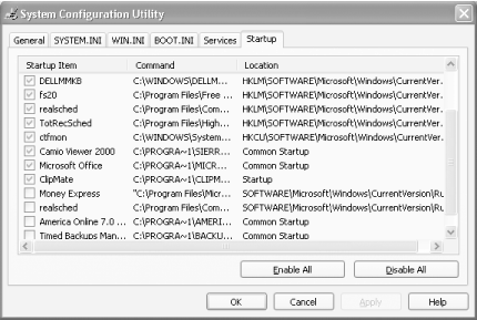 Taking the previous steps will stop the obvious programs from running at startup, but it won't kill them all. The best tool for disabling hidden programs that run on startup is the System Configuration Utility, shown in Figure 1-5. To run it, type msconfig at a command prompt and press Enter. (If that doesn't work, first do a search for msconfig.exe, and then when you find the file, double-click it.)